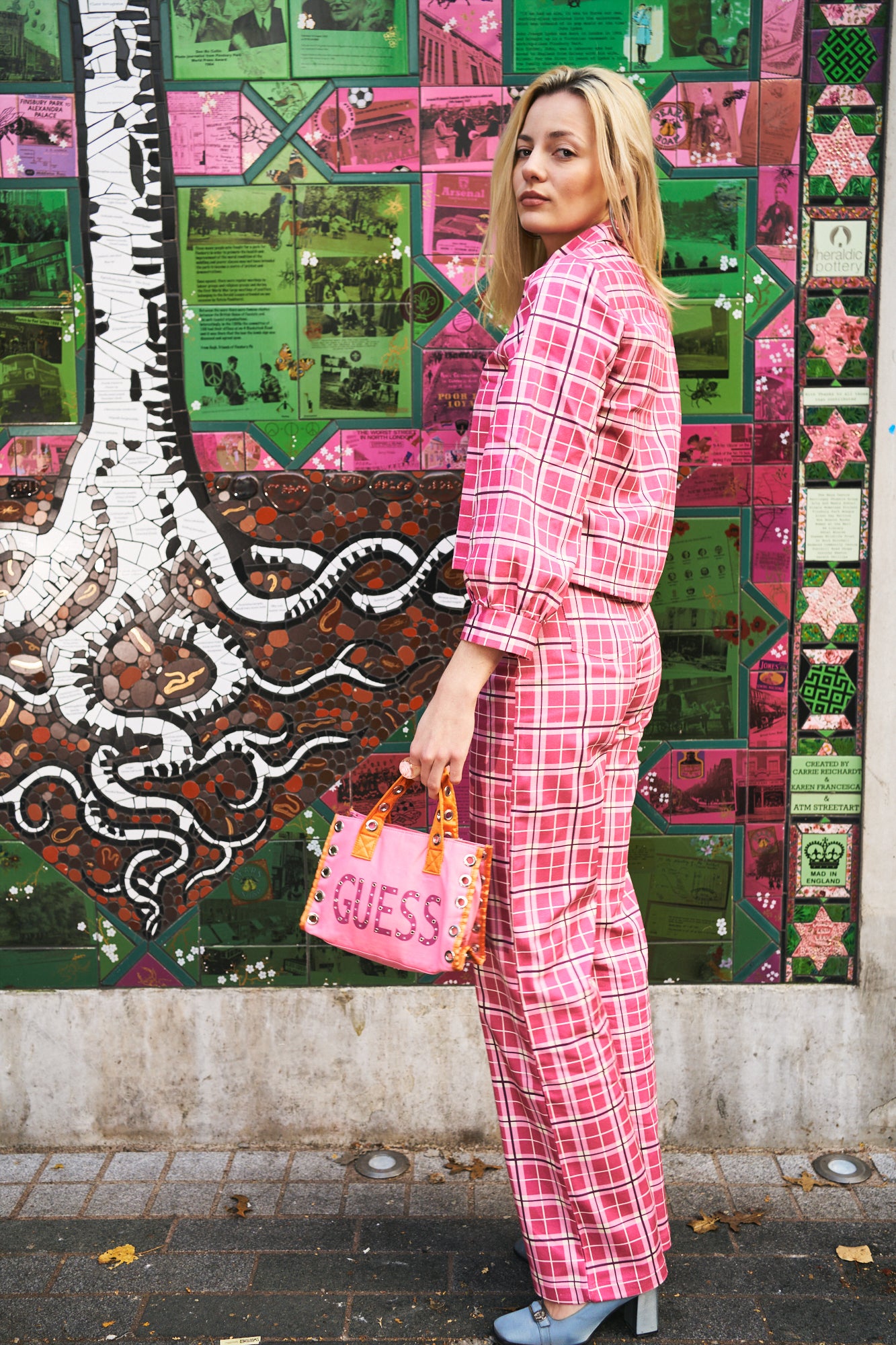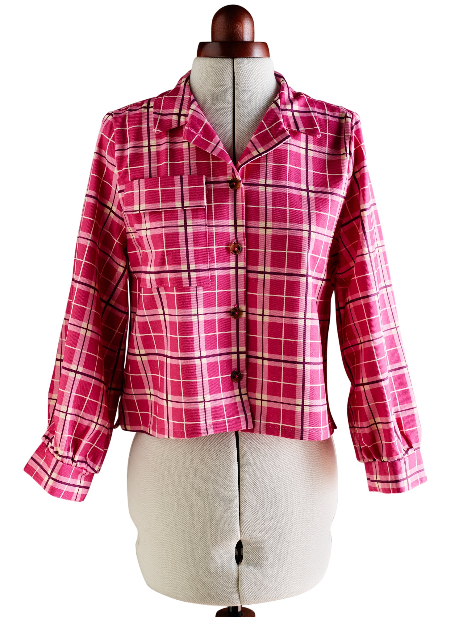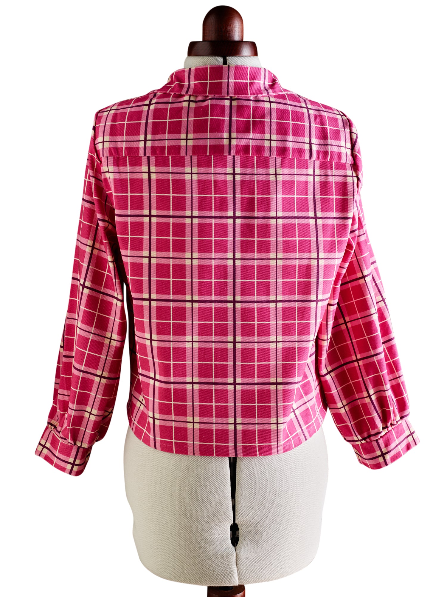 The Cherry Shirt, by Amlul. Bomber shirt with pink plaid print. This versatile piece can be worn both as a shirt or as a jacket. Best combined with the Amlul Cherry Trousers.