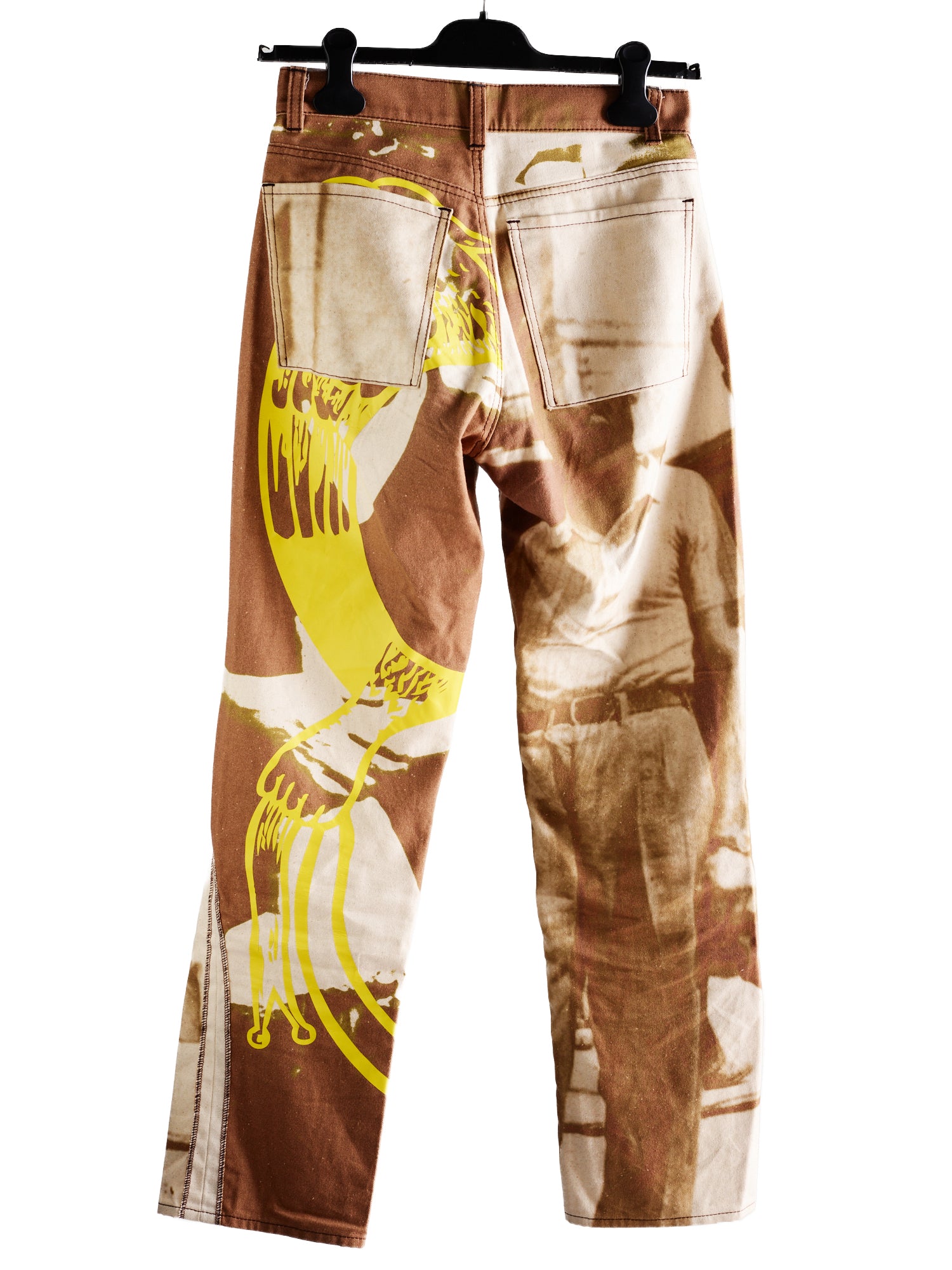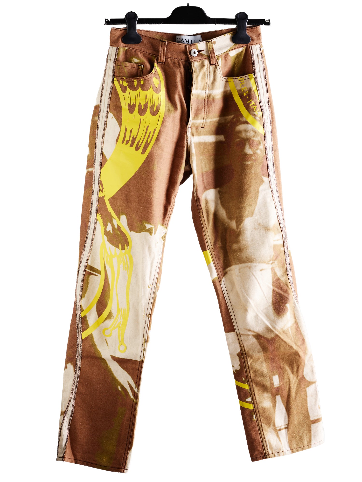 Custom-made Camilla Damkjaer trousers. Completely unique - the trousers were custom made for a vintage seller and therefore exist nowhere else. Brown and beige people photographic design with yellow detailing.