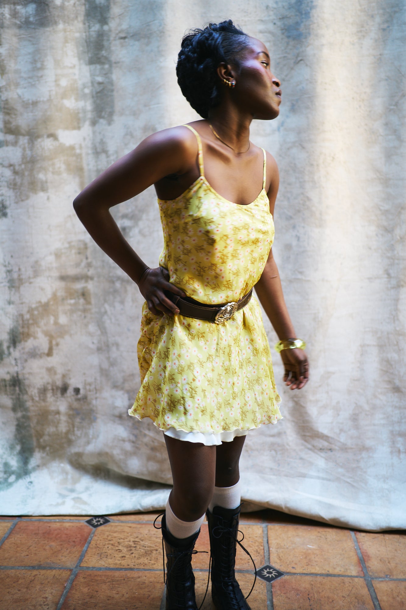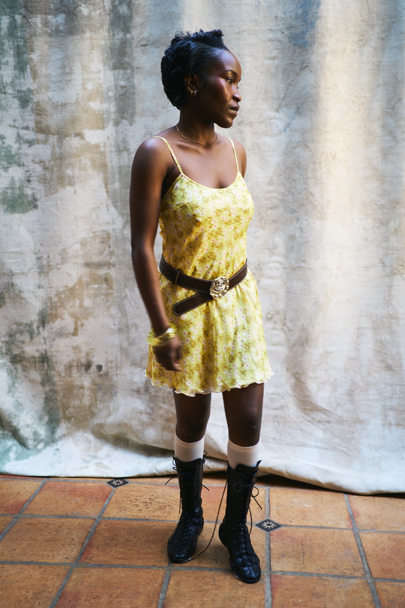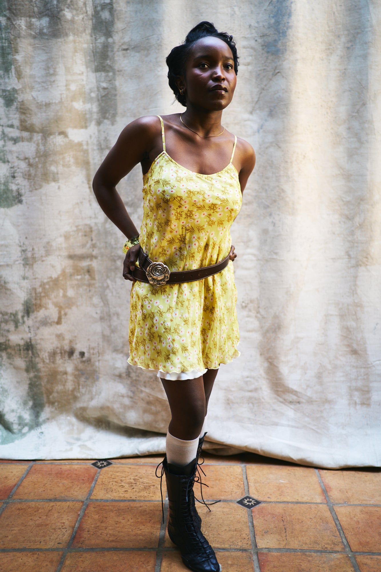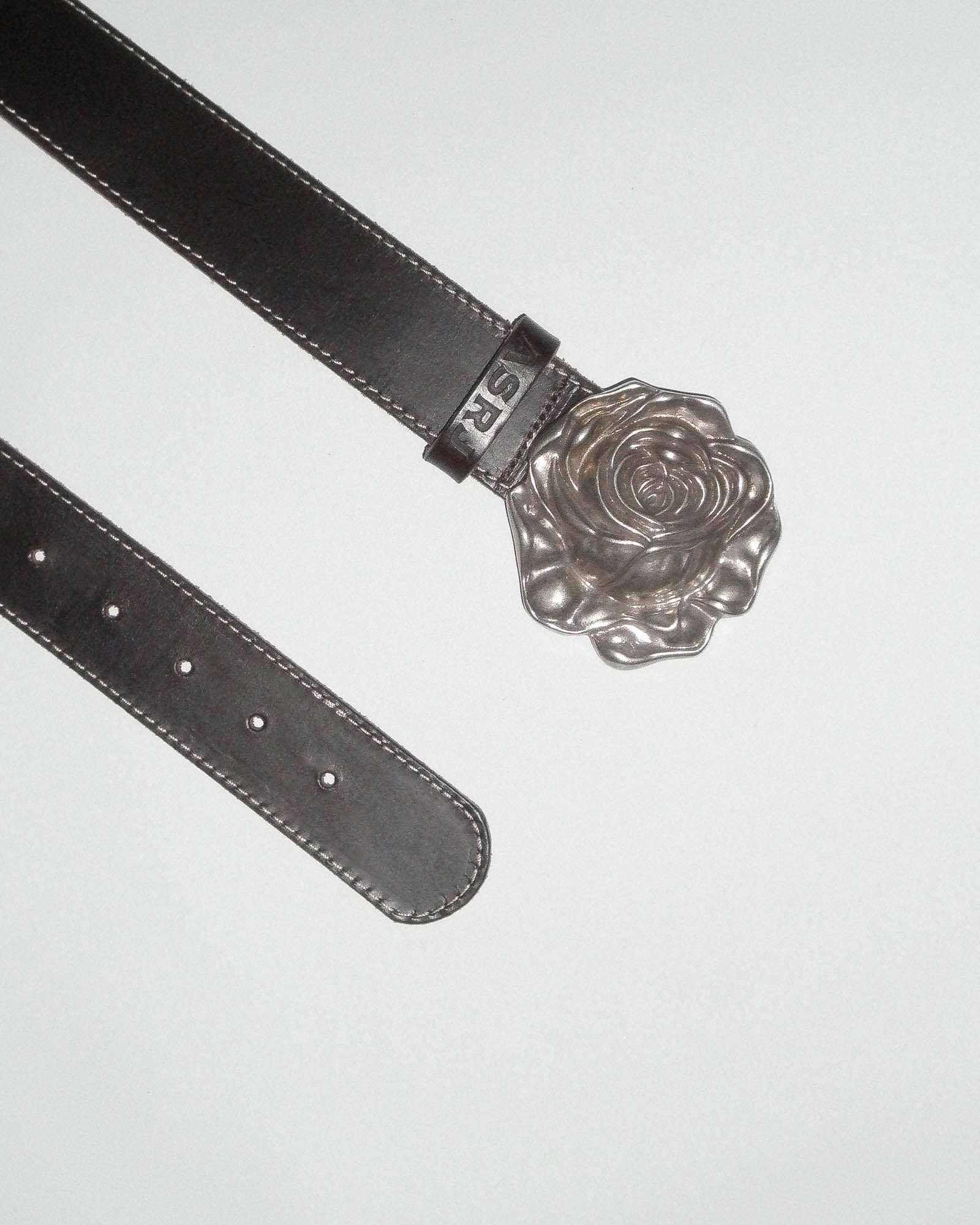 Dark brown leather belt with unique vintage rose buckle and contrast stitching. Made from high-quality brown Italian leather. Leather is tanned using natural plant extracts, reducing environmental impact and enhancing durability.