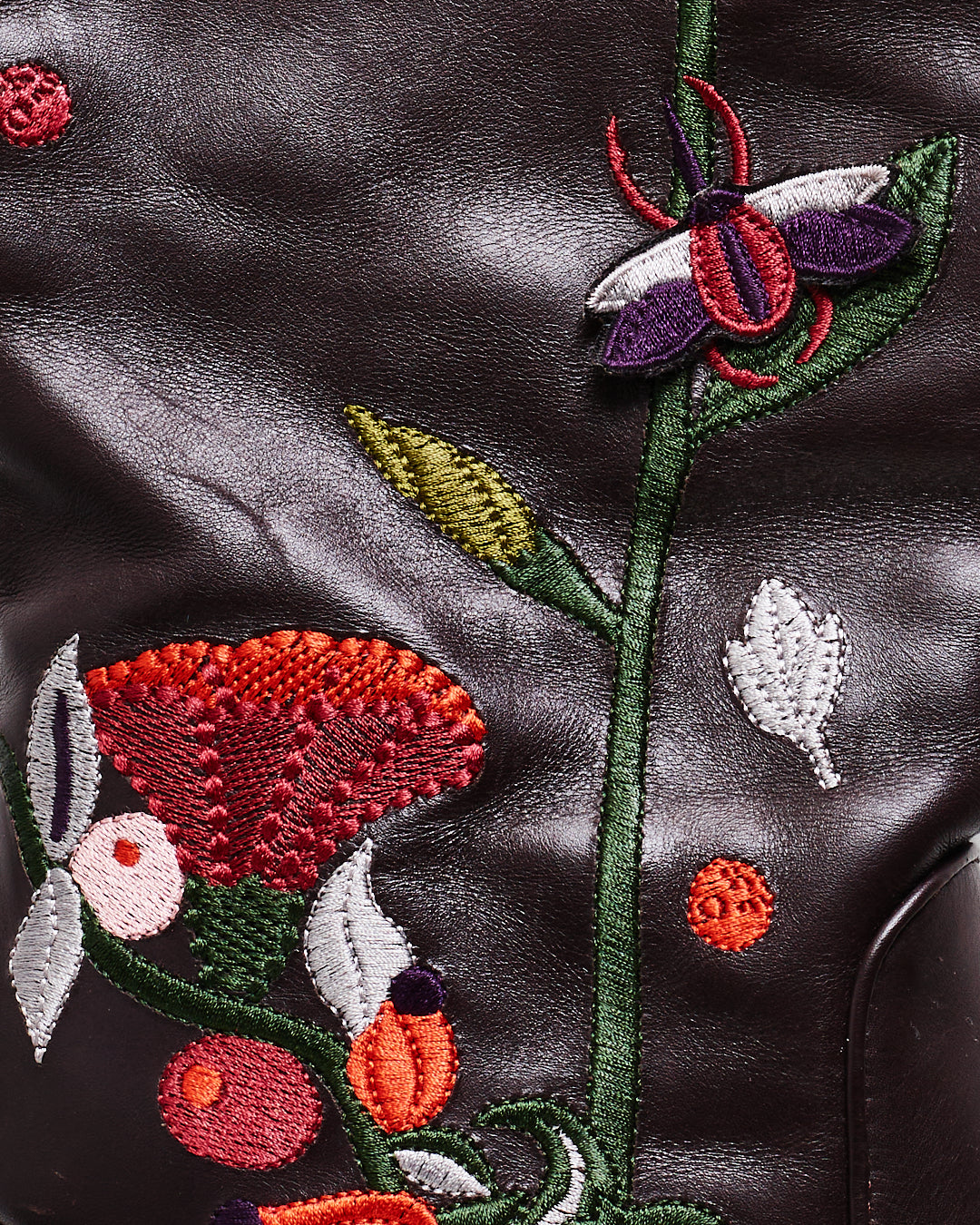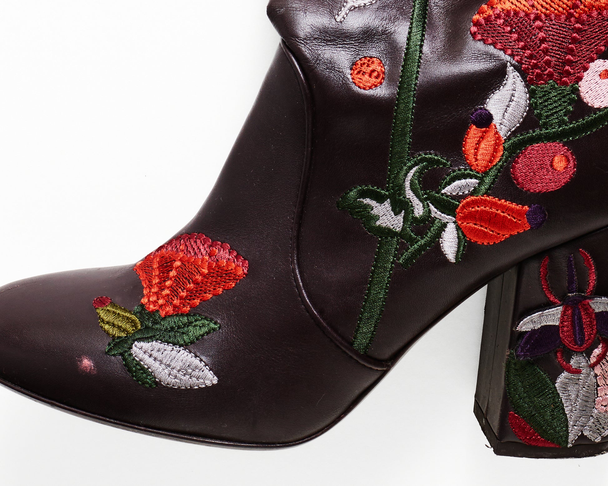 Knee high Laurence Dacade leather riding boots. Brown leather with multi-coloured floral embroidery all over - some embroidered insects are 3D. Pull on. Labelled size EU 39 but would also fit a 38. These have been worn and there are some signs of wear (pictured). But they are in an overall good condition. Very unique, I haven't seen these anywhere else.