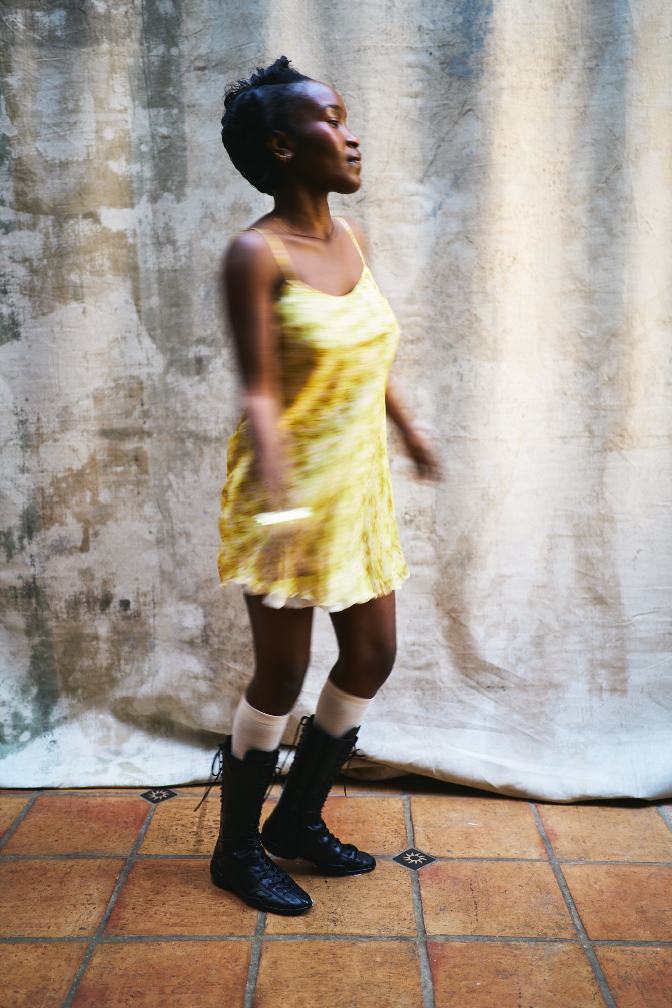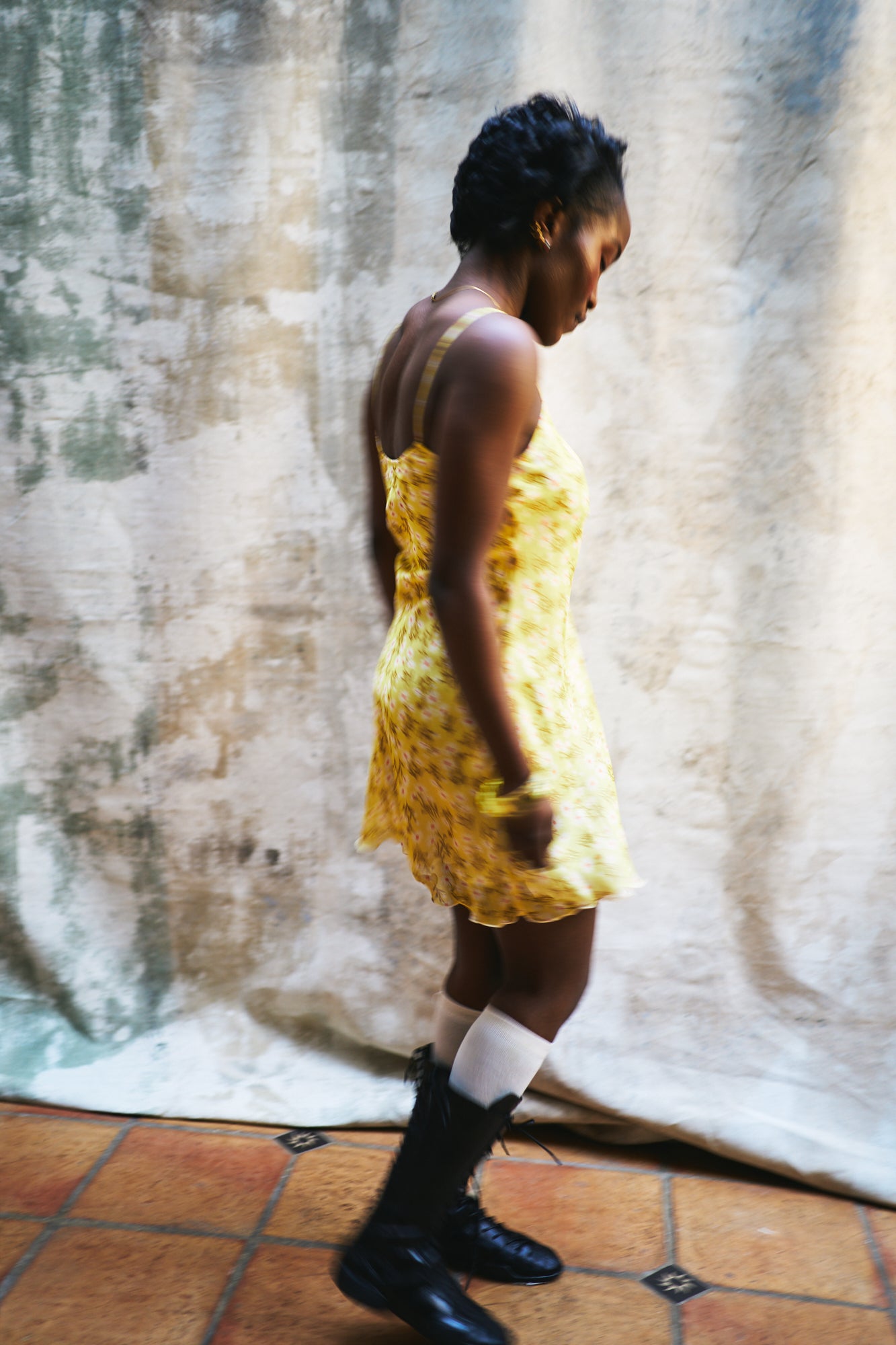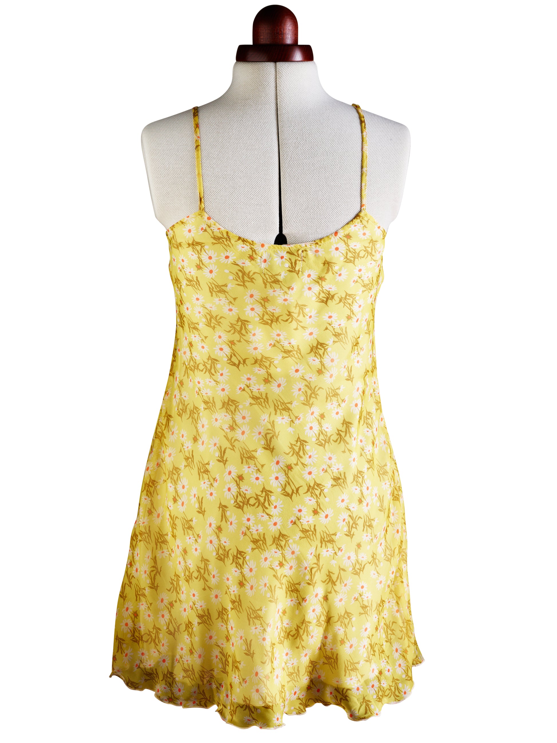 Lena yellow flowers babydoll muslin silk dress, by Maison Cléo. Beautiful pattern with small delicate flowers all over. Flow shape. Lined with muslin cream silk. 100% silk.