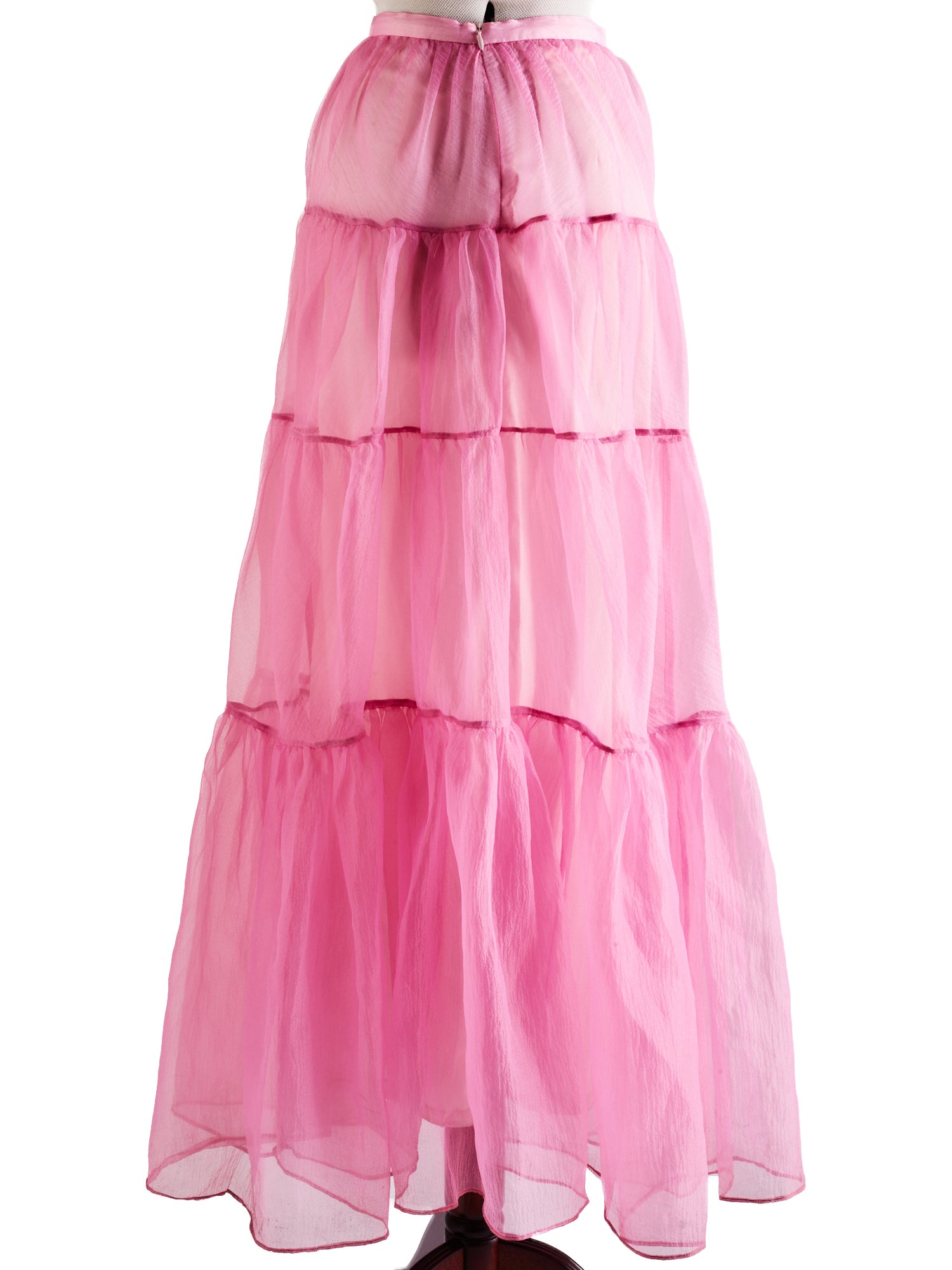 Marked UK size 4. However, this item is modelled on, and fits, a UK size 6. RRP £299.00. Lined, so not sheer when worn. Pink cotton lining features a thigh-high slit up each side to allow for easy moving. Tiered silhouette, hook-and-eye fastening and hidden zip at the back.