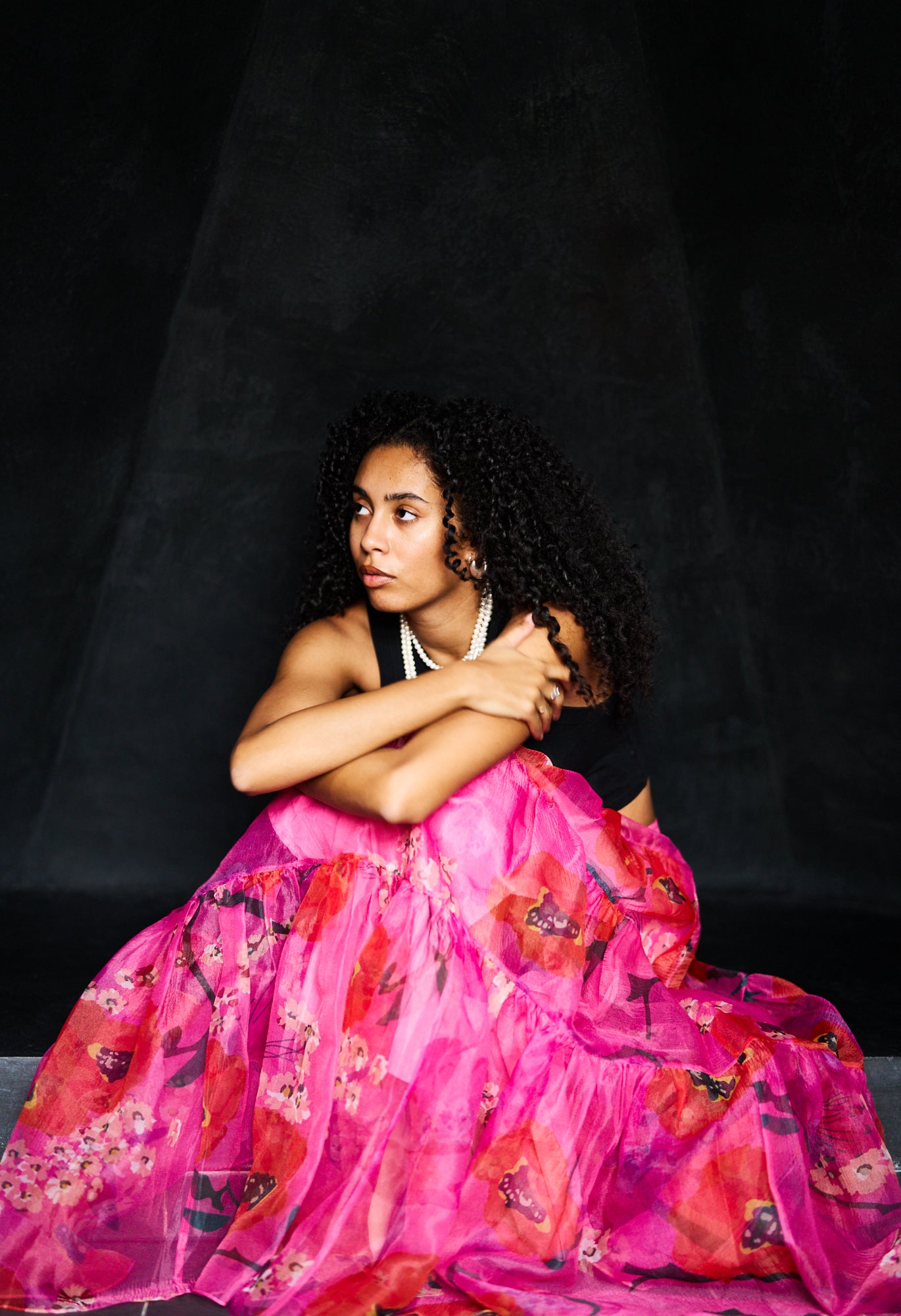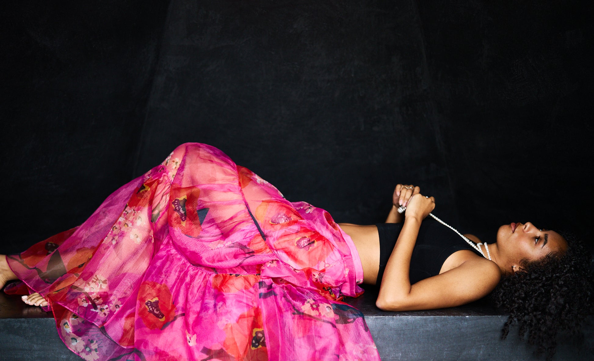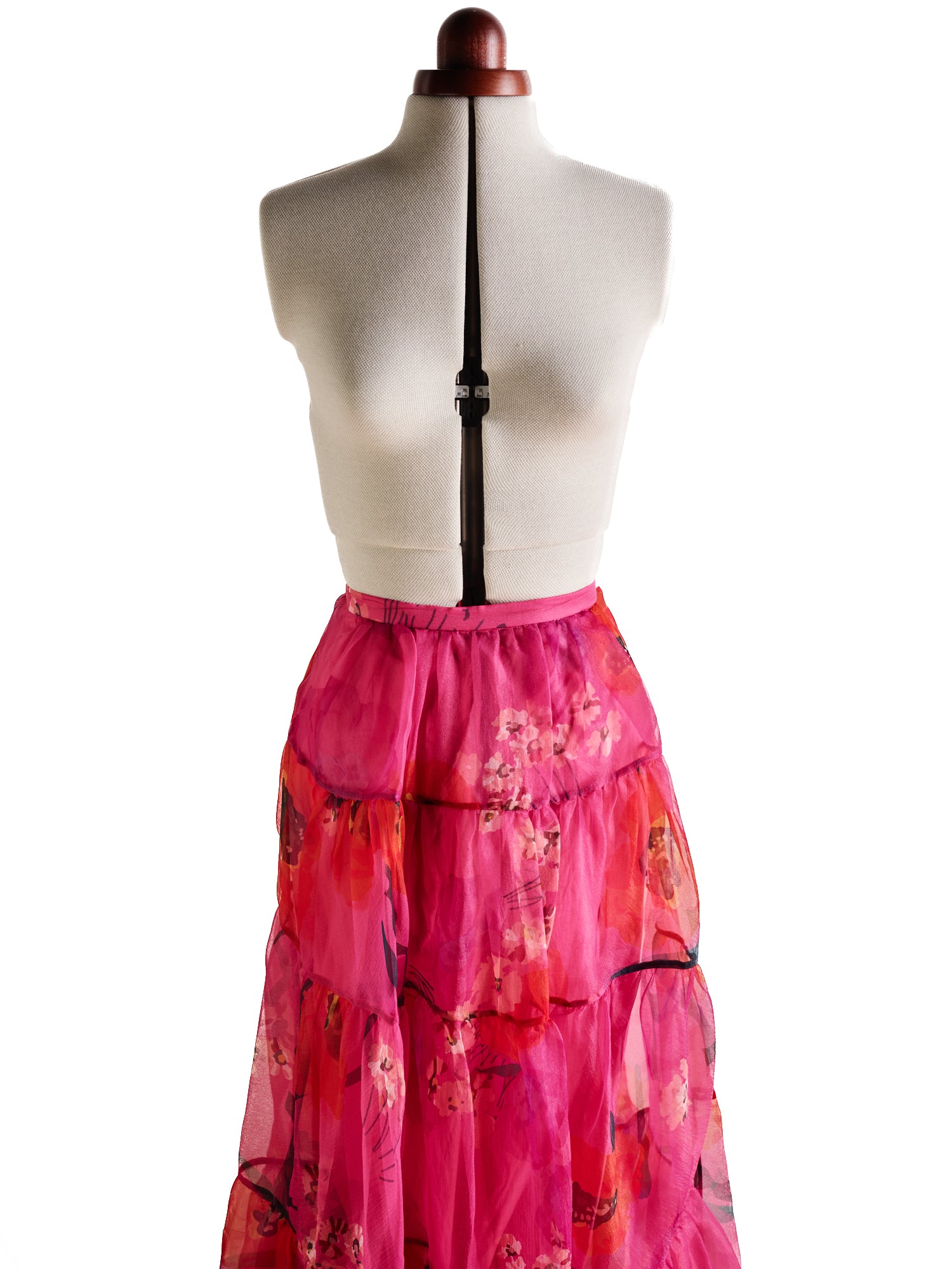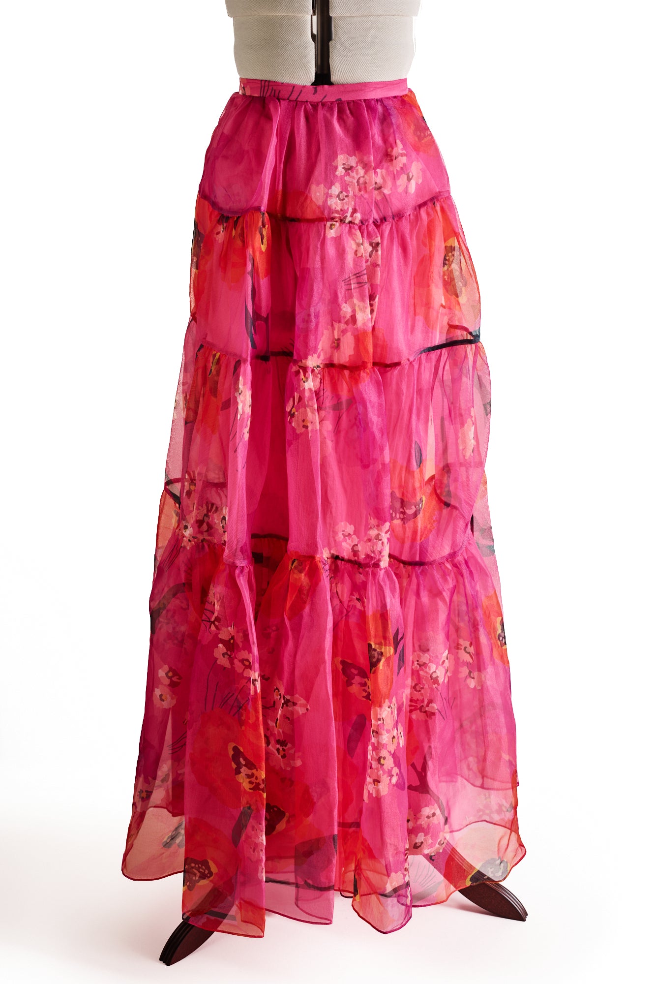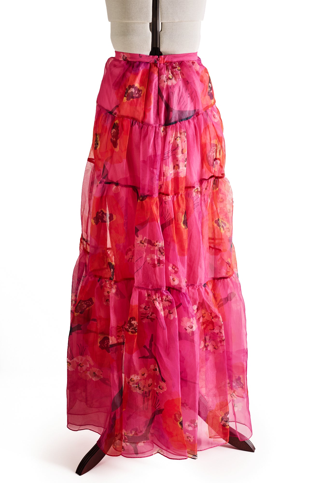 STAUD Dragon Skirt in California Poppy Peony. UK size 8, modelled on a UK size 8. RRP £299.00. Lined, so not sheer when worn. Pink cotton lining features a thigh-high slit up each side to allow for easy moving (this is how the leg is visible in image 2). Tiered silhouette, hook-and-eye and hidden zip at the back.