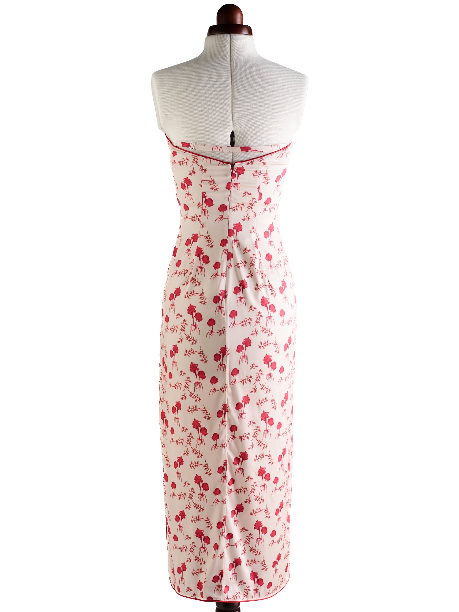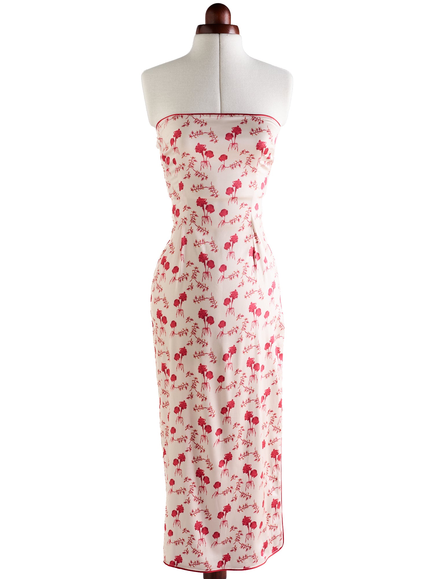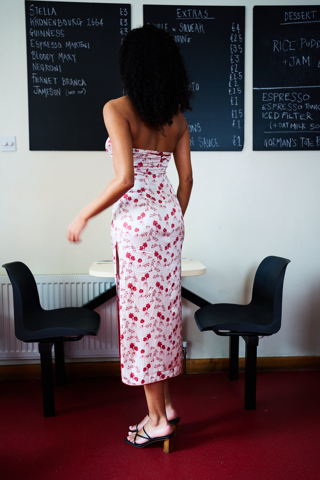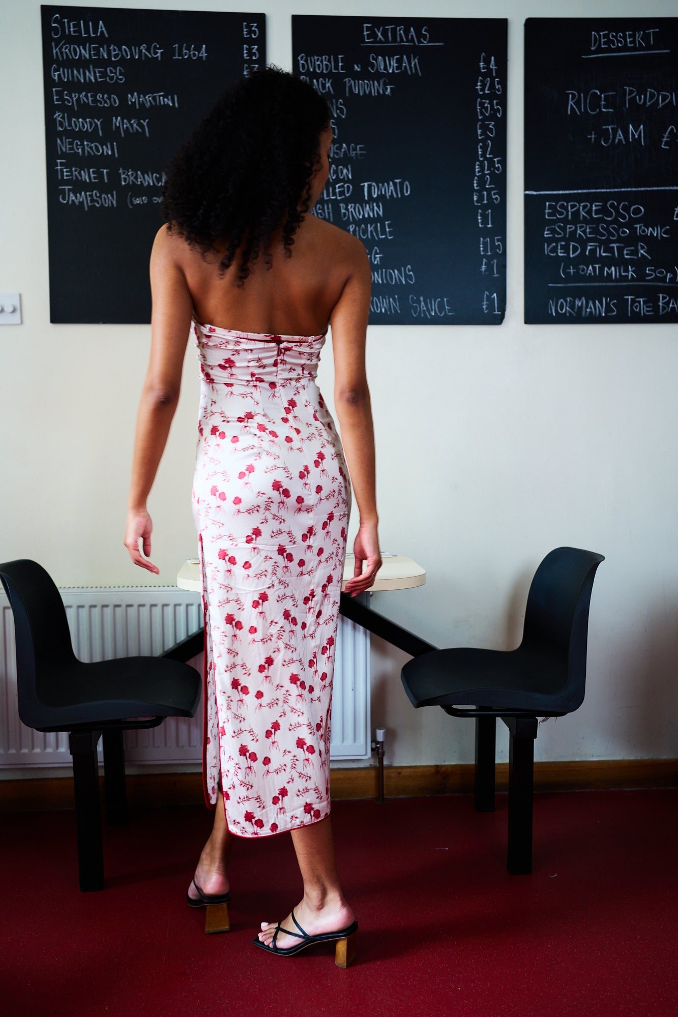 The Alma Dress, by Amlul. This dress features a strapless neckline and midi length. Perfect for any occasion, it effortlessly complements any body type thanks to its viscose fabric. Whether you're attending a formal event or a casual outing, the Alma dress is the epitome of chic style and effortless glamour.