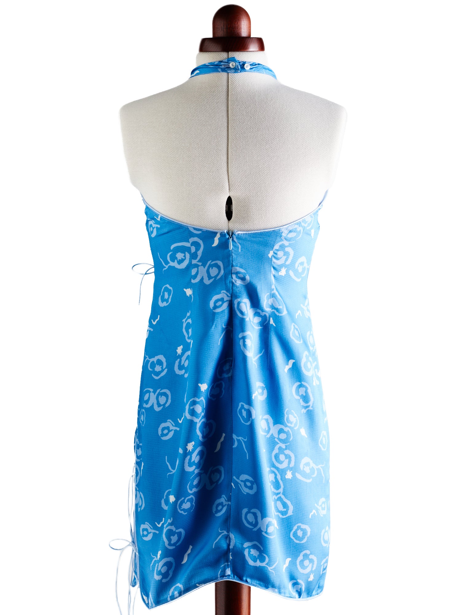 The Bridget Dress by Amlul, Spain. This dress is beautifully original, featuring an open and round neckline adorned with delicate bow detailing. Its elegant length adds versatility, making it perfect for both day and evening wear. This fabric has been crafted in Lake Como, Italy. The print, designed by the renowned Jorge Dana. Buttons around the neck, low back, side ties and back zip.
