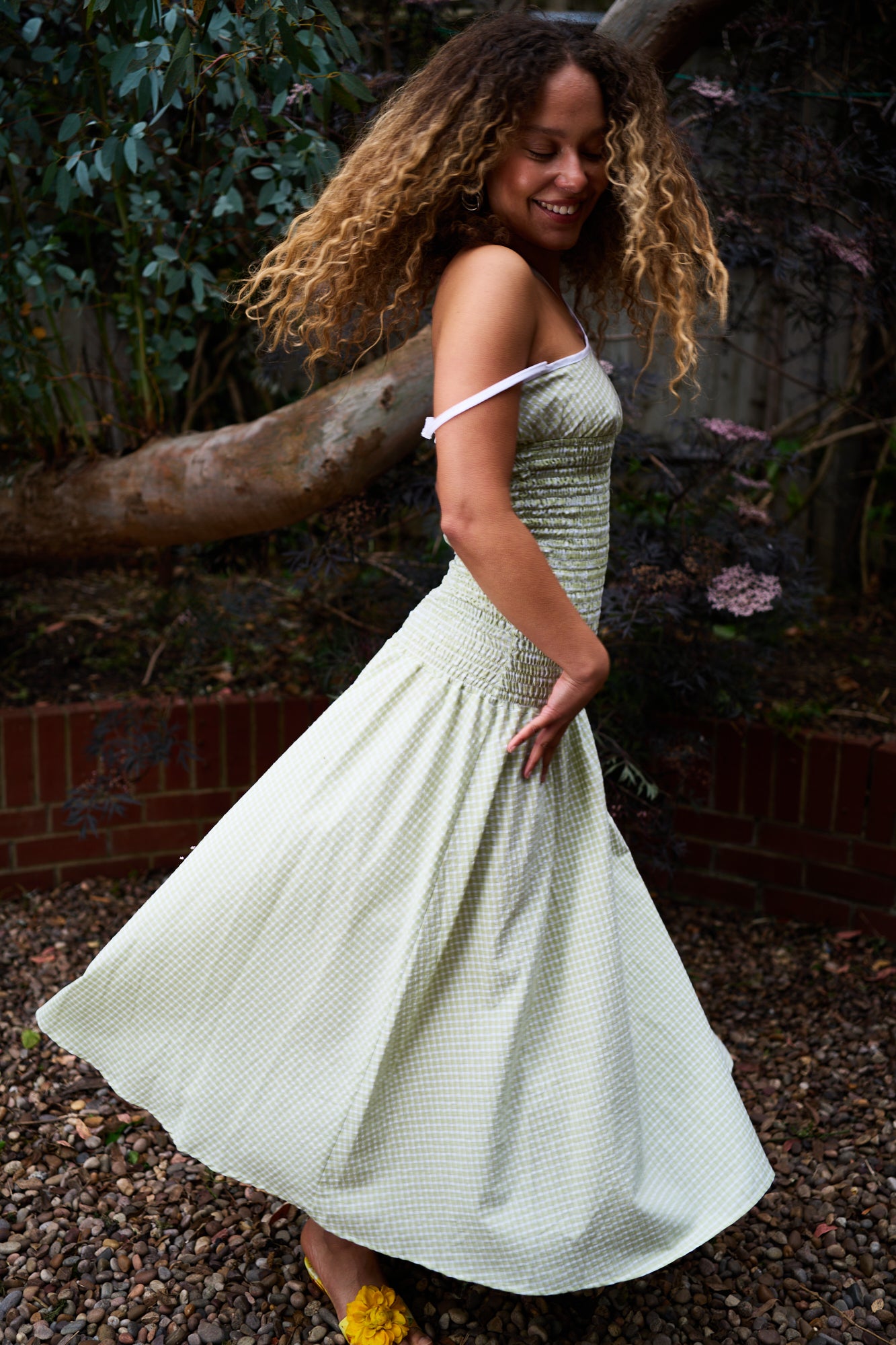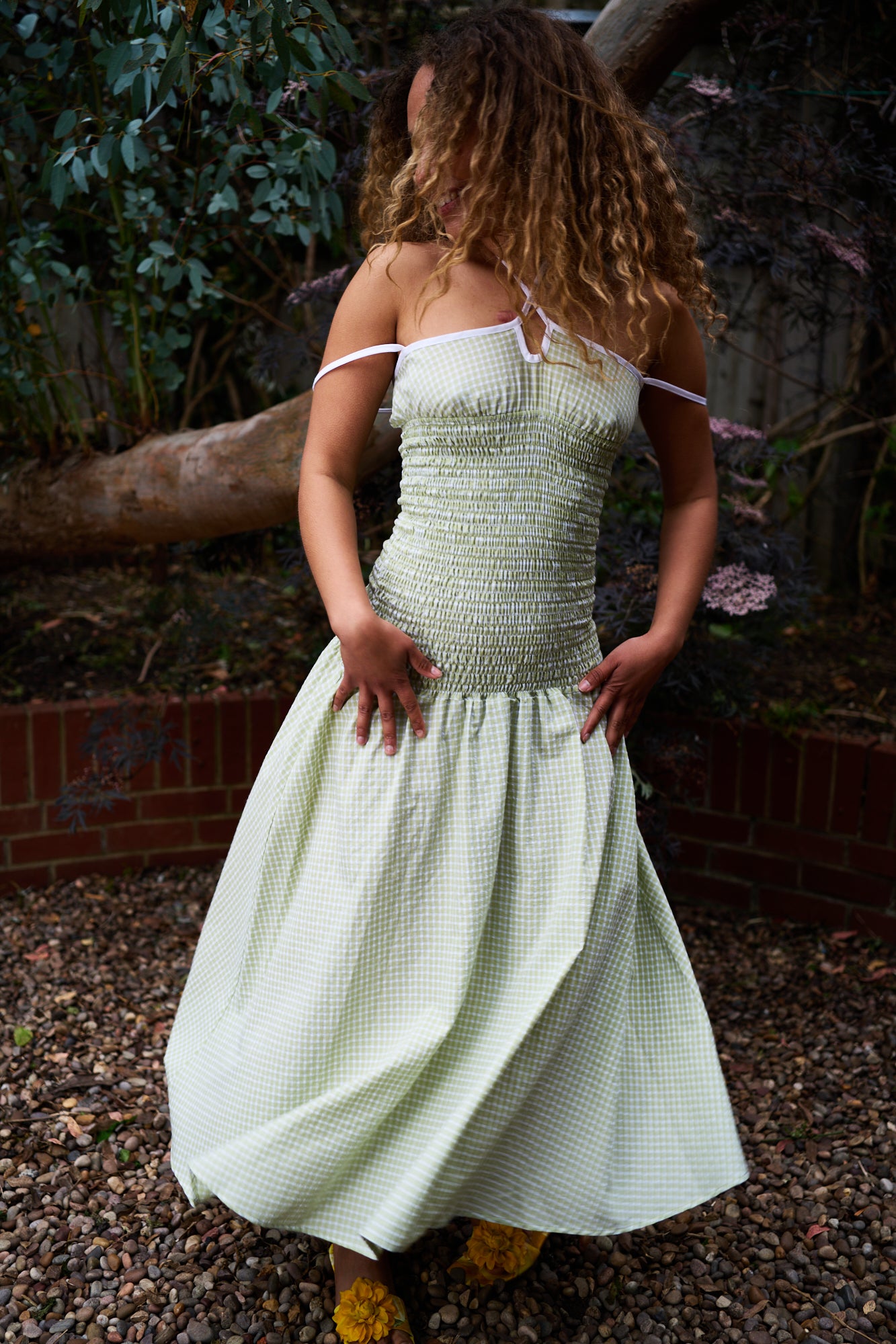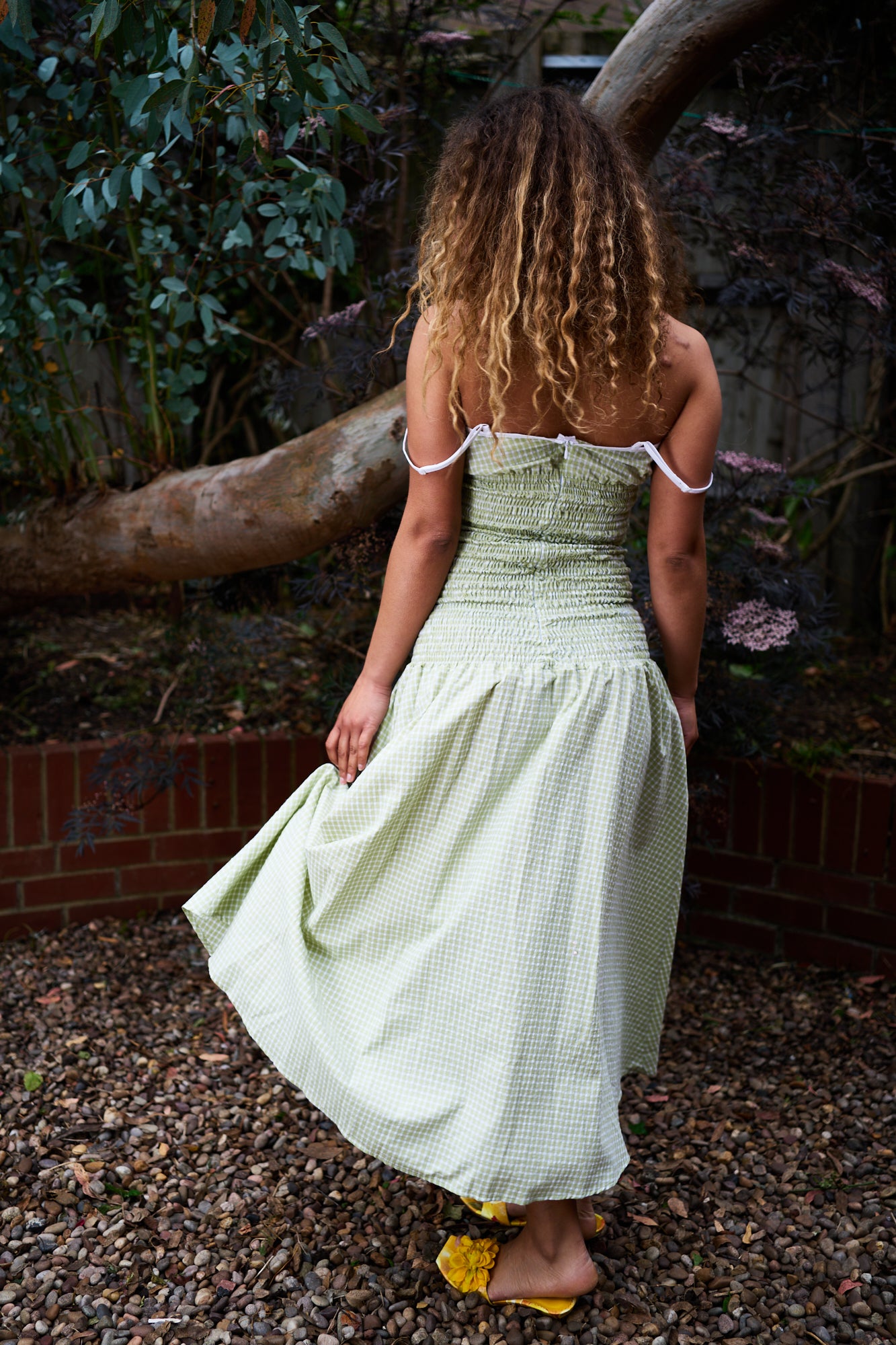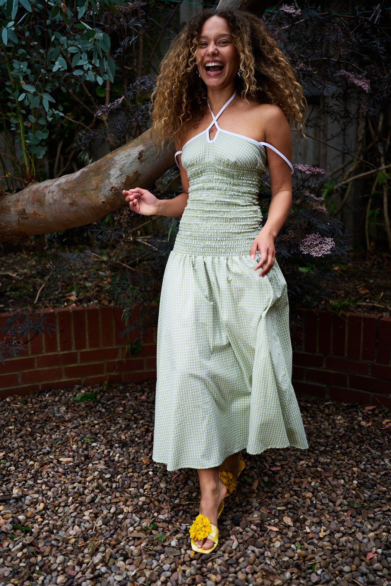 The Gemma Dress by Amlul, Spain. Midi length green vichy print dress. The bodice features a corset-like structure crafted from elastic fabric, enhancing the body's natural curves. Details include white adjustable straps and a ribbon in the front, which can also be worn around the neck for a halterneck style as pictured. Made in the Amlul local factory in Galicia (Spain).