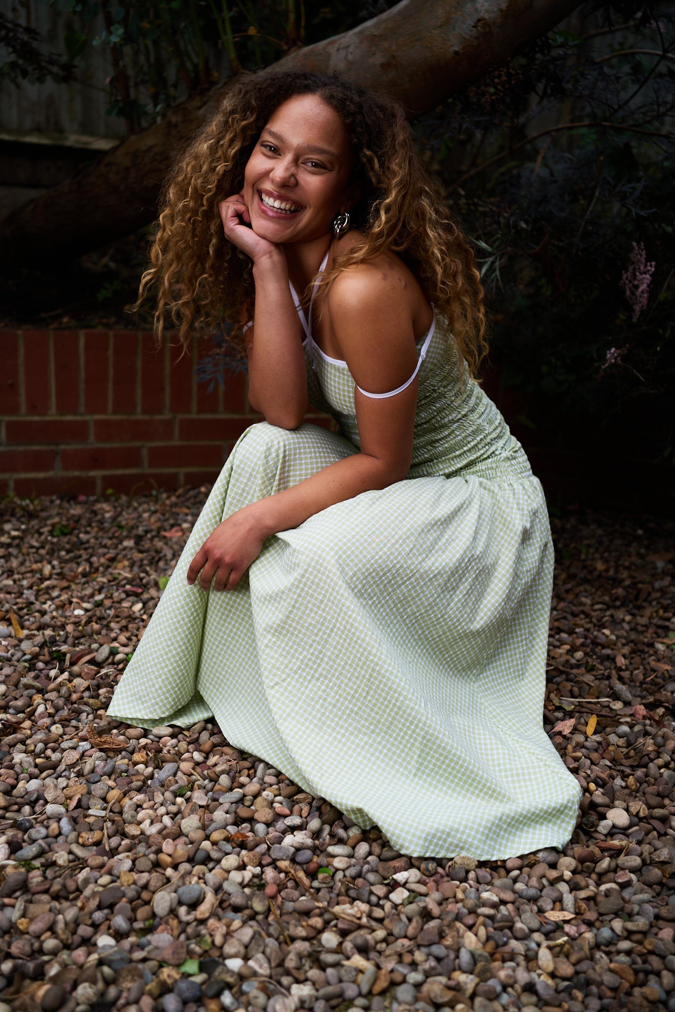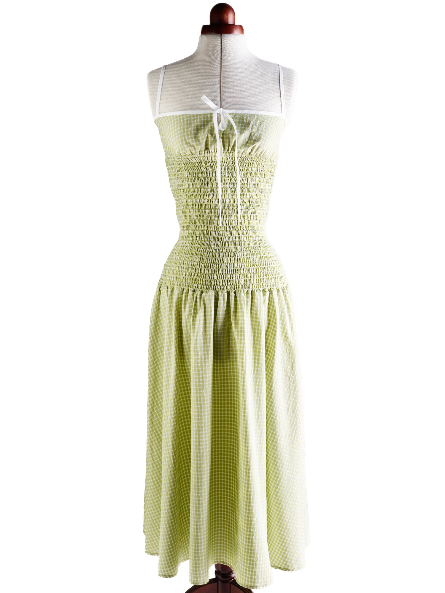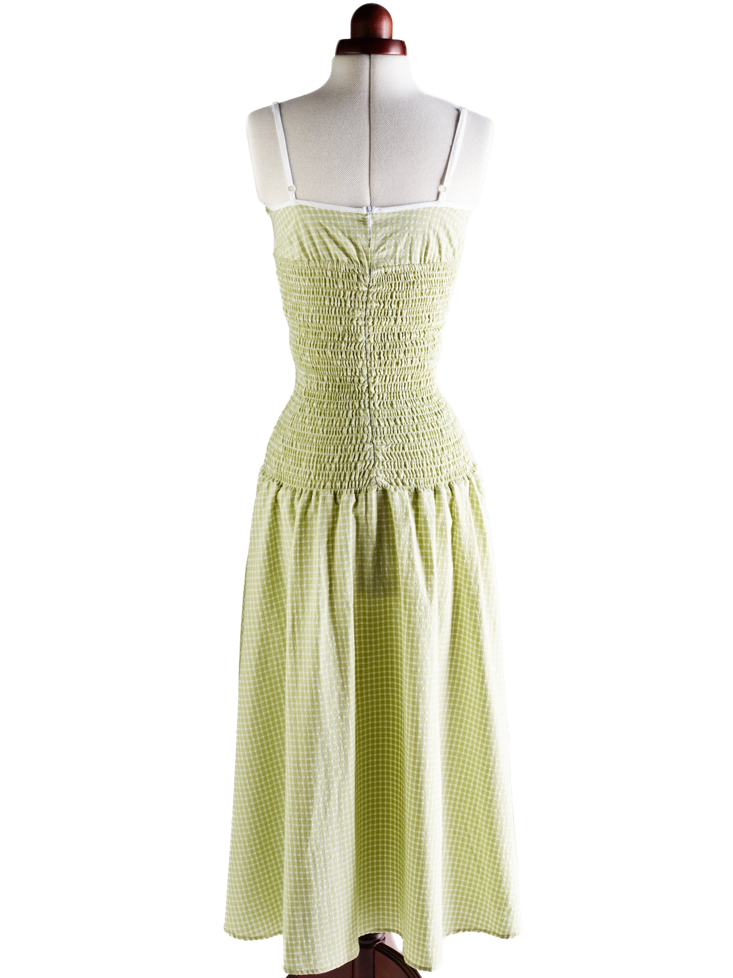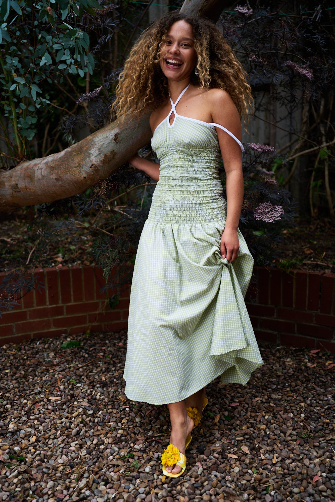 The Gemma Dress by Amlul, Spain. Midi length green vichy print dress. The bodice features a corset-like structure crafted from elastic fabric, enhancing the body's natural curves. Details include white adjustable straps and a ribbon in the front, which can also be worn around the neck for a halterneck style as pictured. Made in the Amlul local factory in Galicia (Spain).