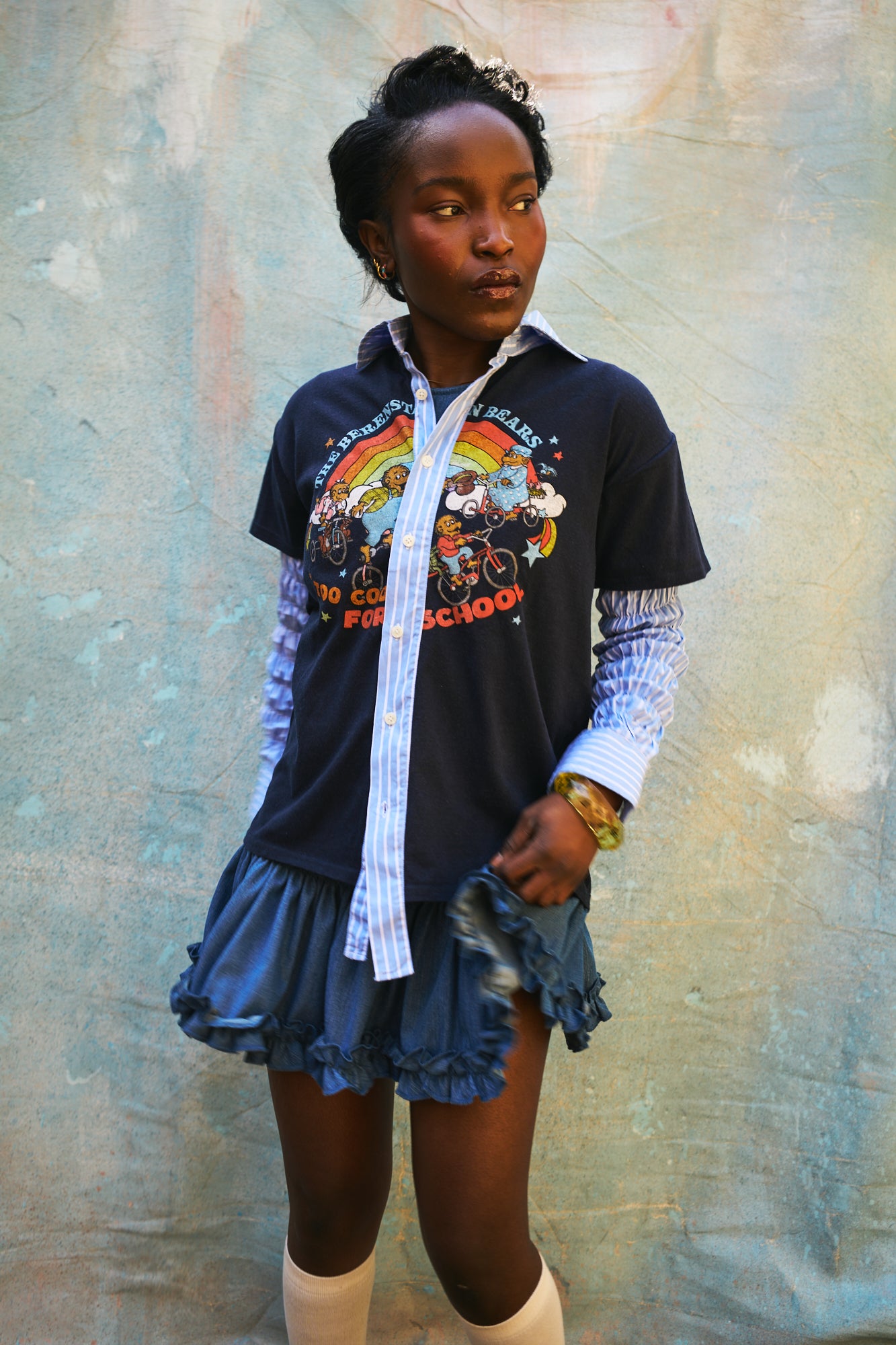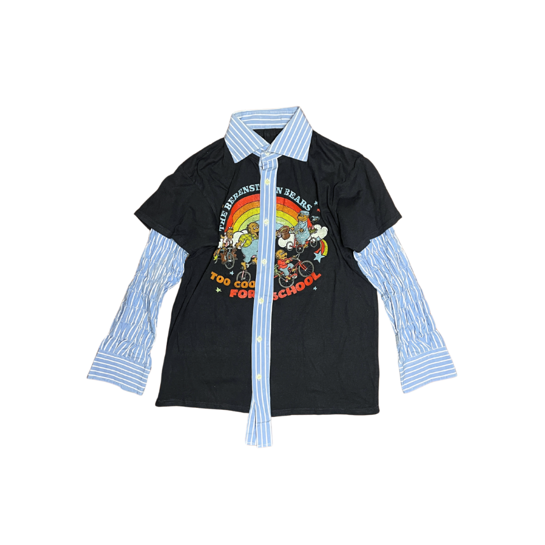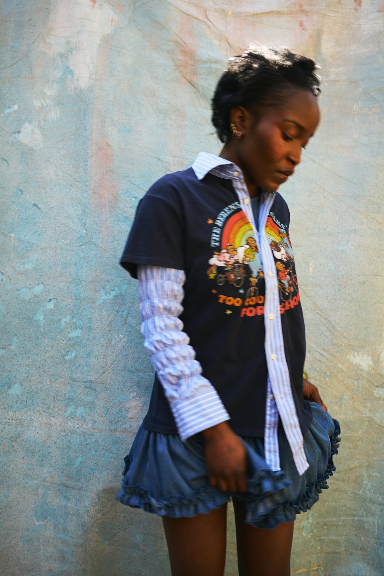 A hybrid style, the love-child of a striped Oxford shirt and a slogan tee. Handpicked piece-by-piece for their silly little slogans and paired with a more sensible partner, the Oxford shirt. Unique by nature, no two pieces are the same and identicals will never be restocked.