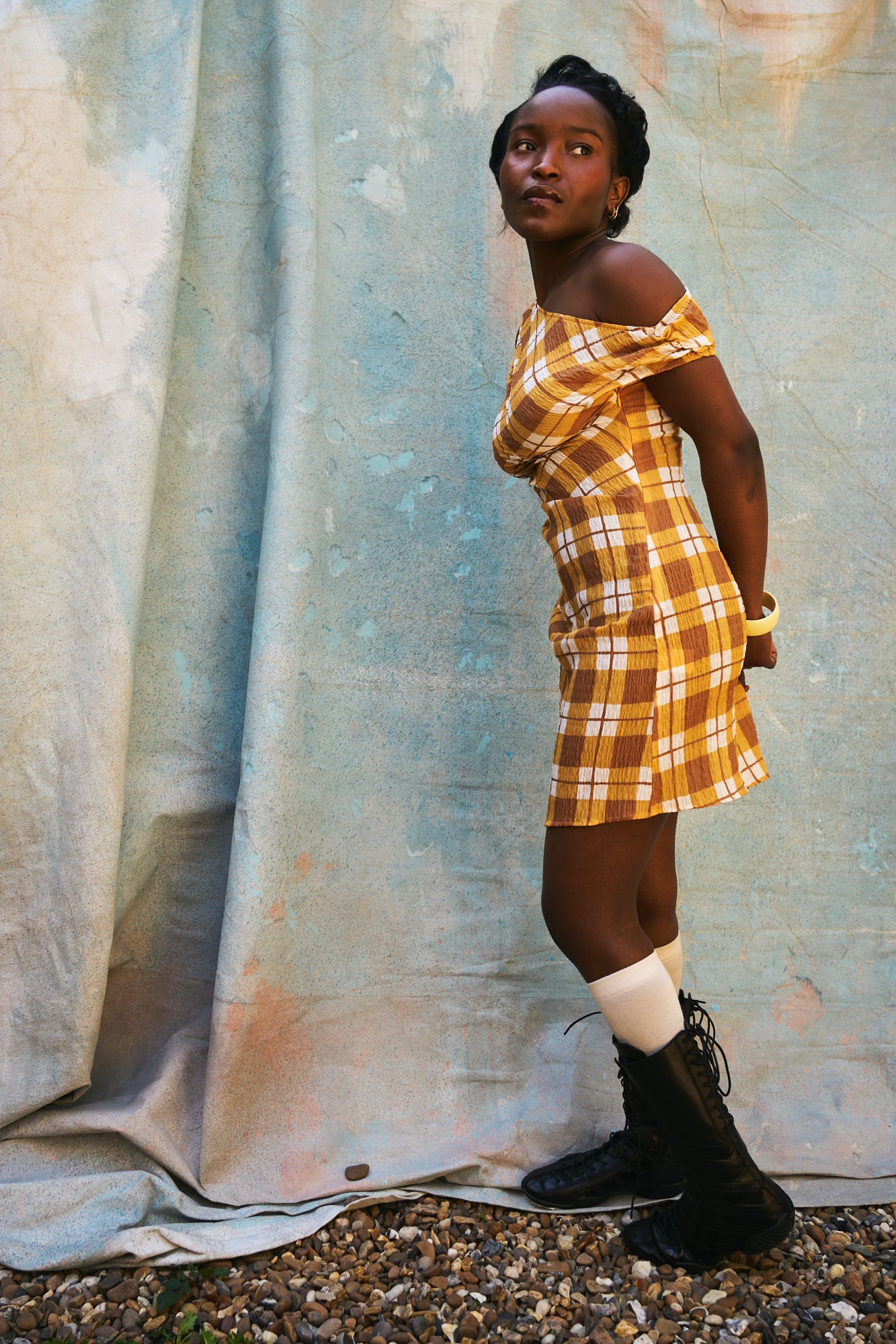 The Scotch Butter Dress by Amlul, Spain. The perfect little asymmetric dress. The print is a unique creation by the Amlul in-house design team. And the fabric is sourced and manufactured in Italy, showcasing the brand's commitment to quality and craftsmanship.