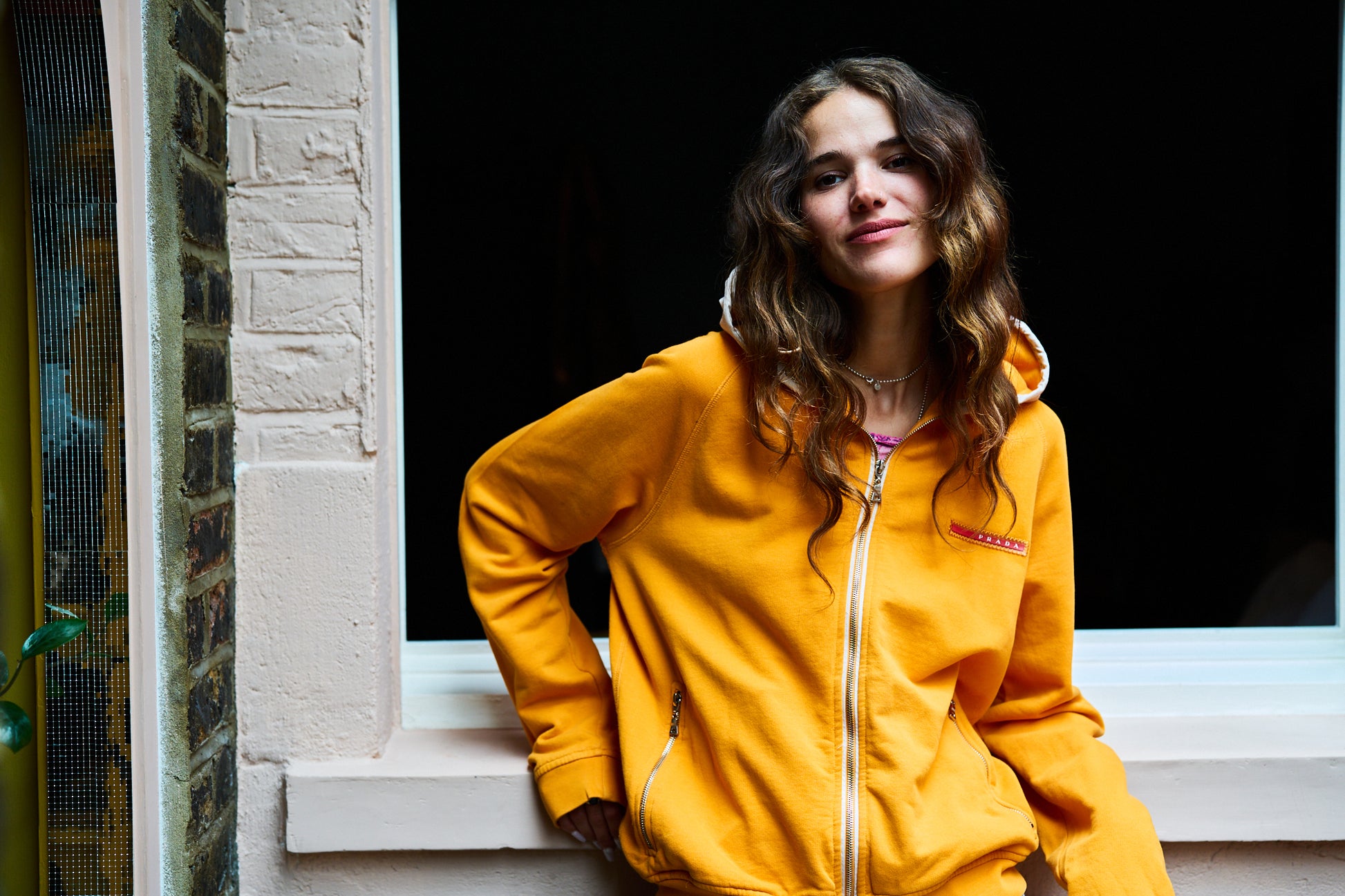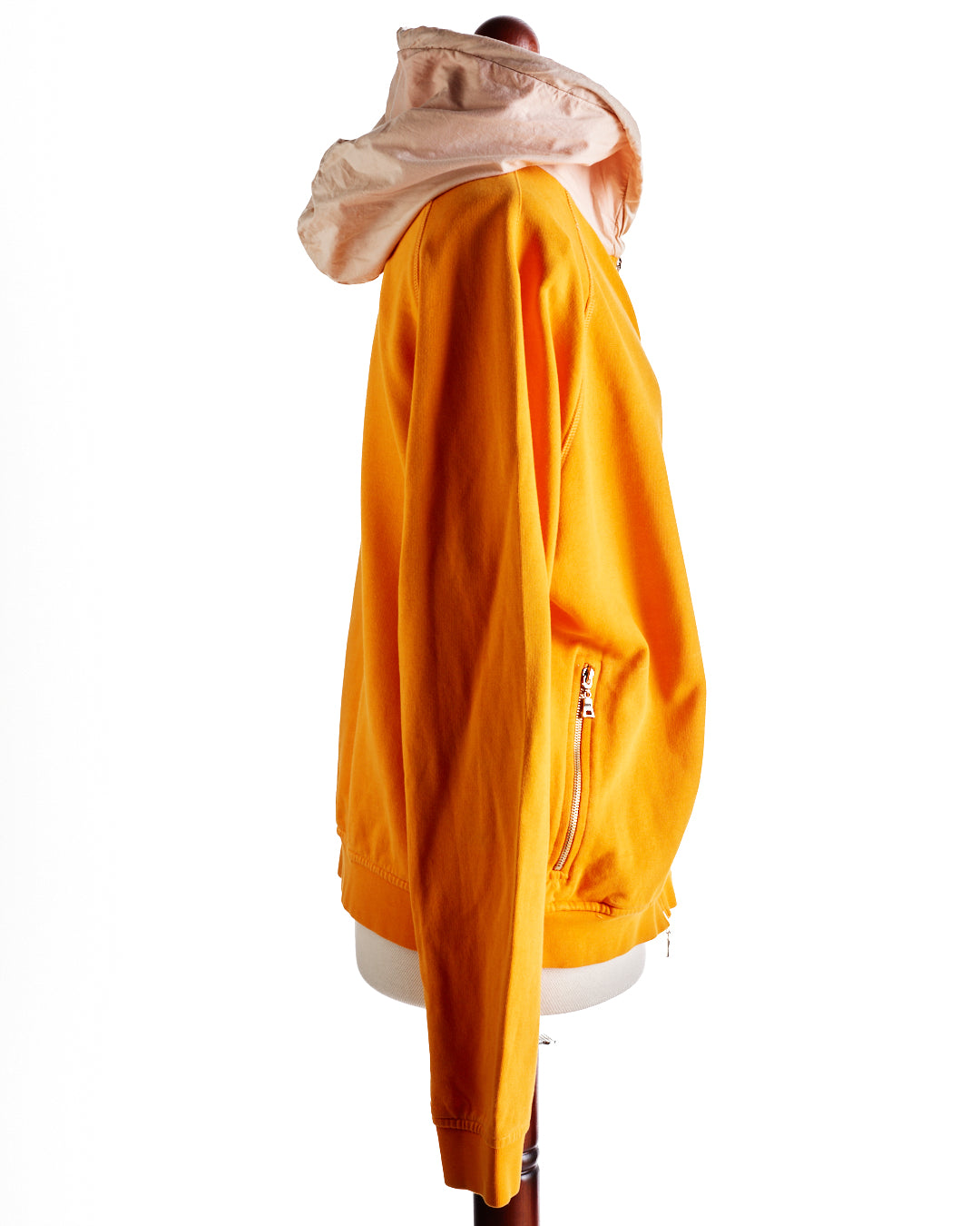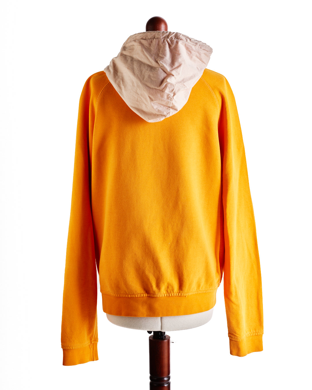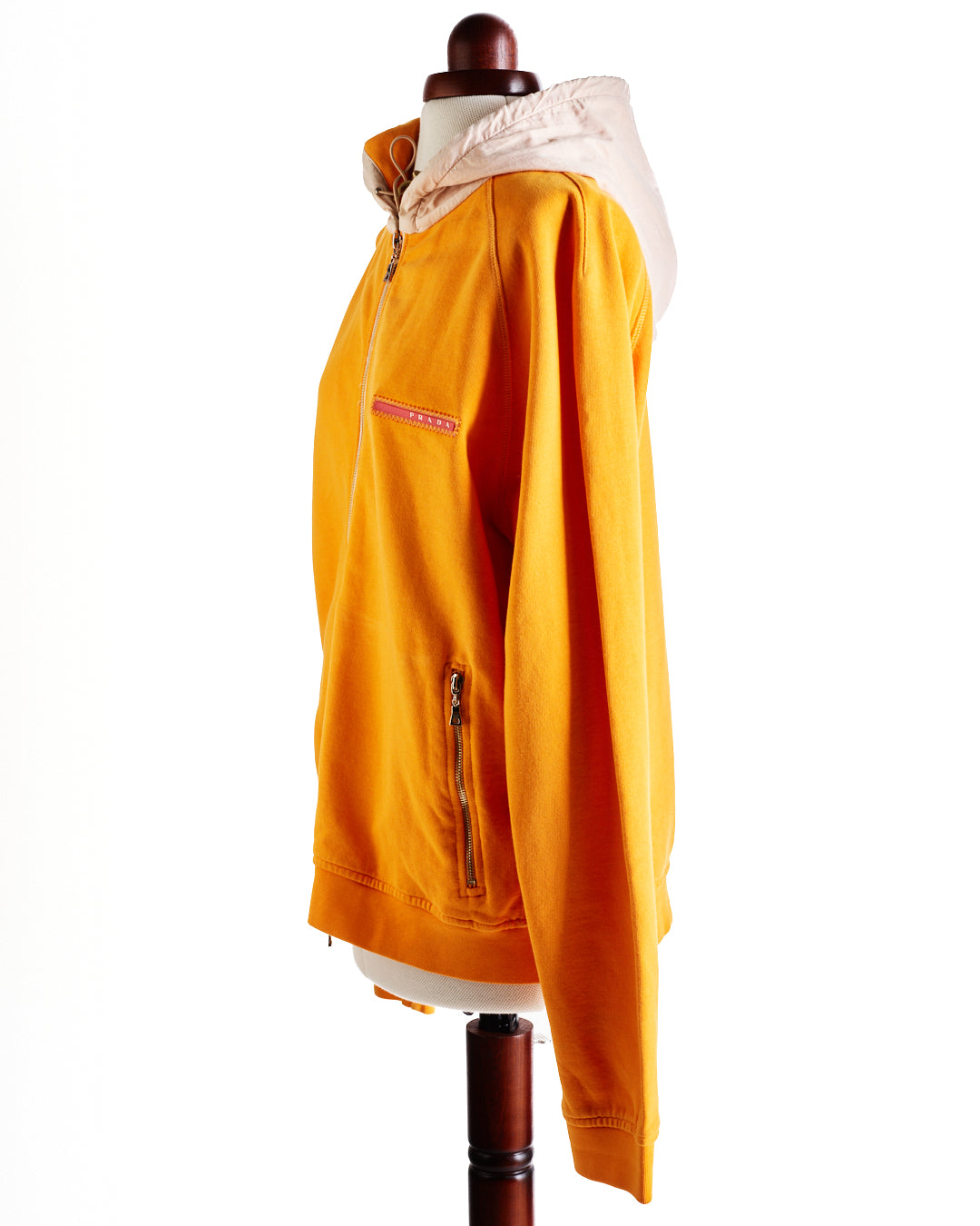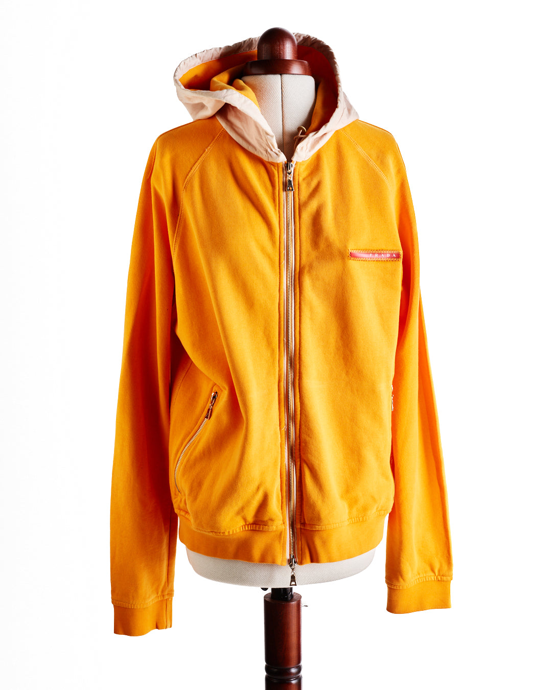 Orange Prada Sweater. Marked size XL (would fit a size 8/10 nicely for an oversize fit). Features a light tan hood with elasticated drawstring and toggle. 2 silver metal zip pockets with the same material as the hood on the pocket inside.