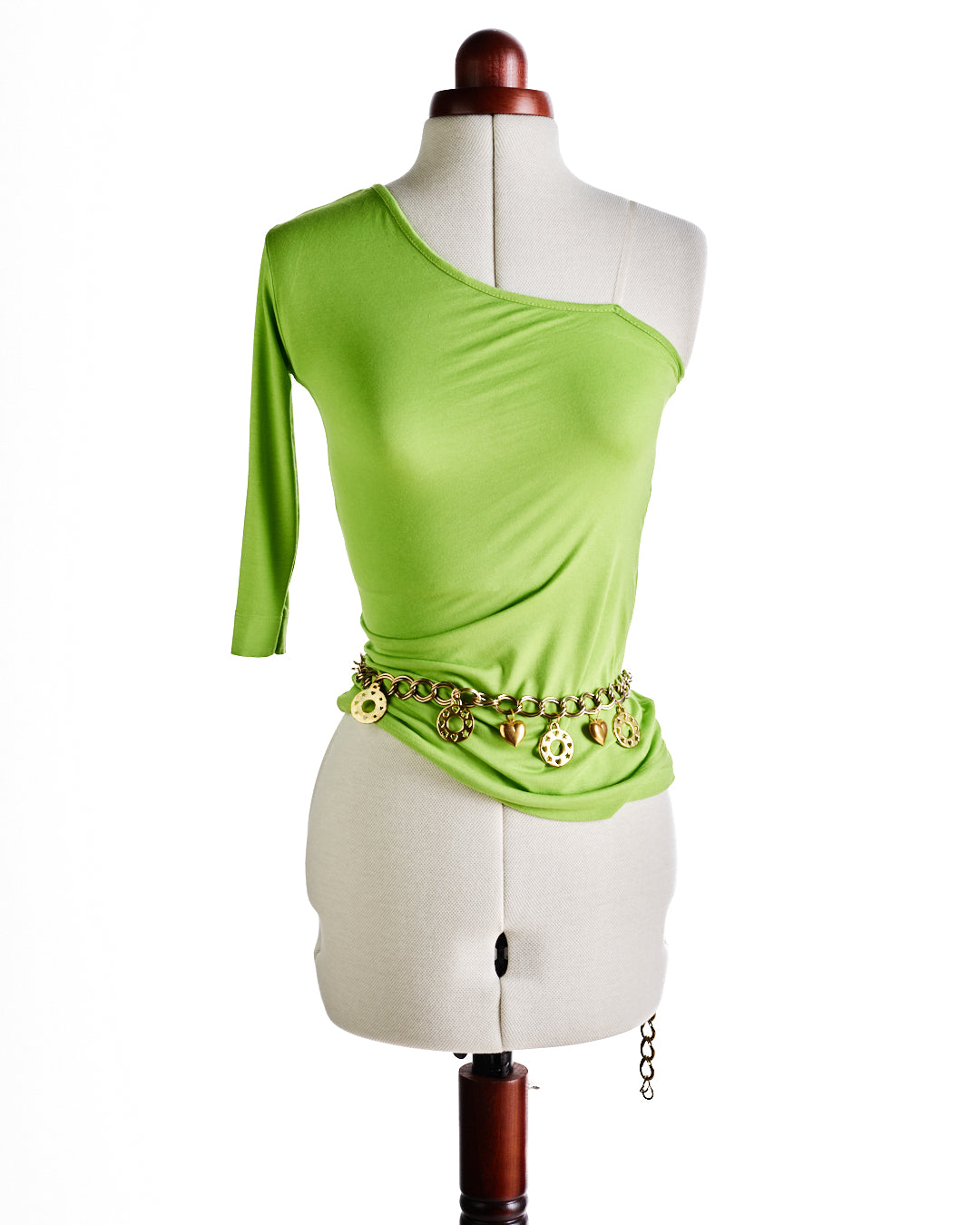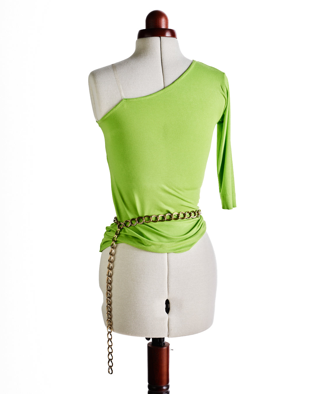 Unsigned one-shoulder green long-sleeve top. Unmarked size, but would fit a UK size 8. Sheer, white ribbon on the side without the sleeve. Sourced in Naples, Italy.