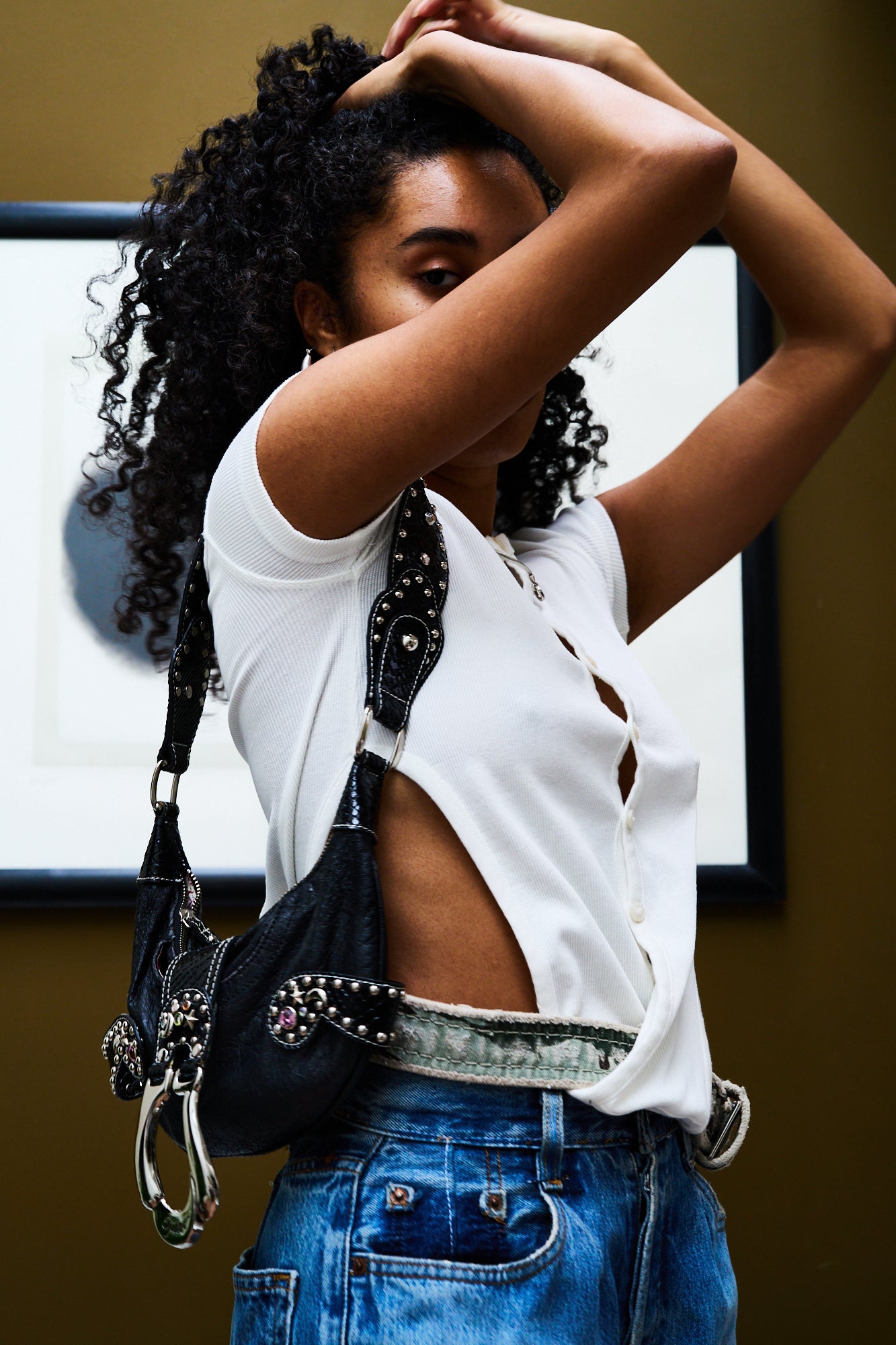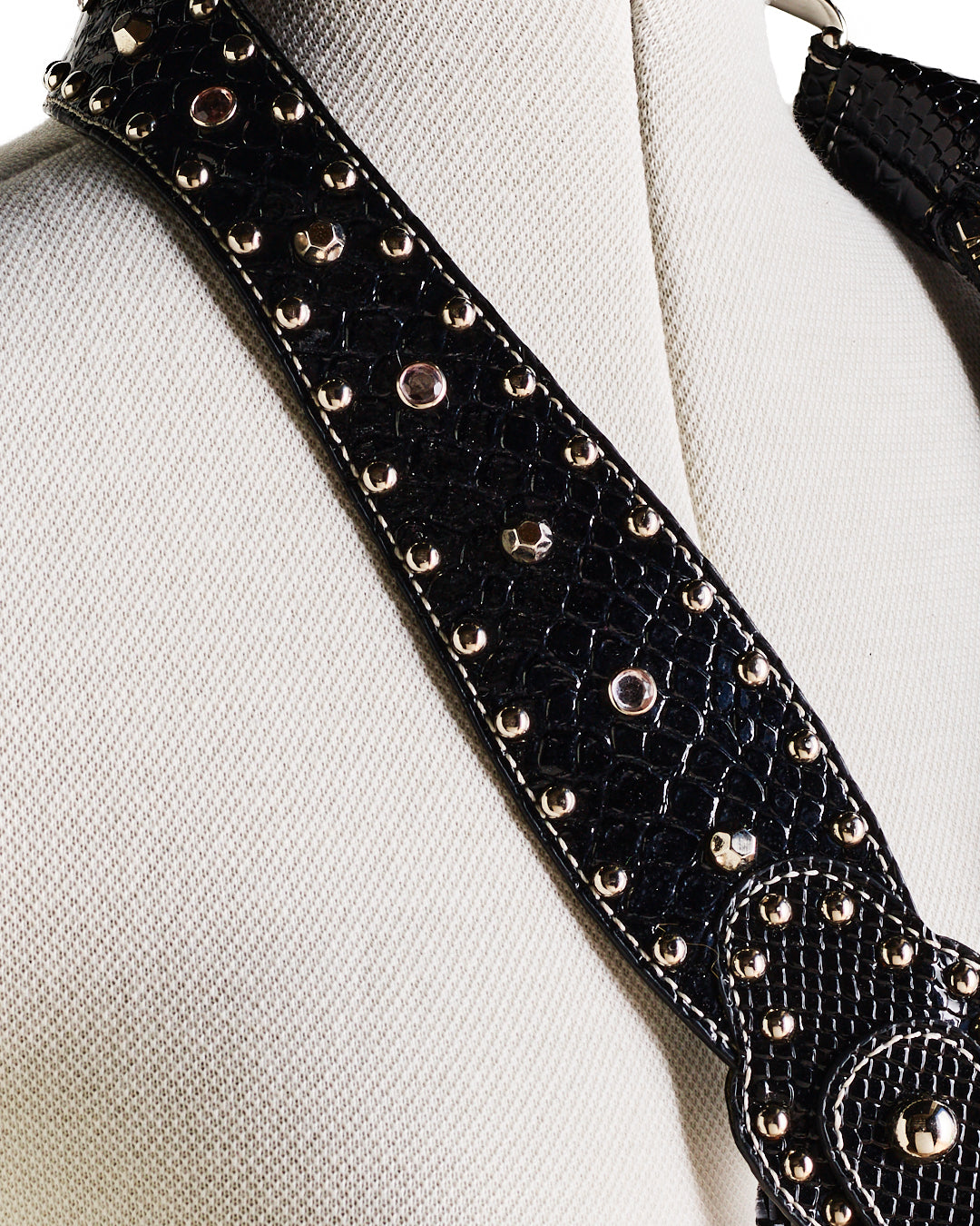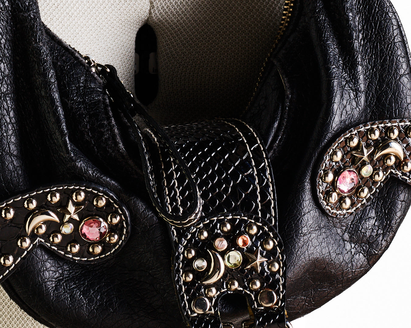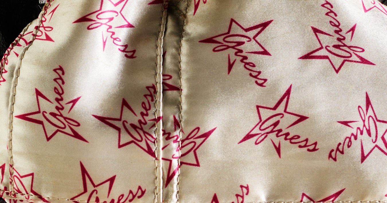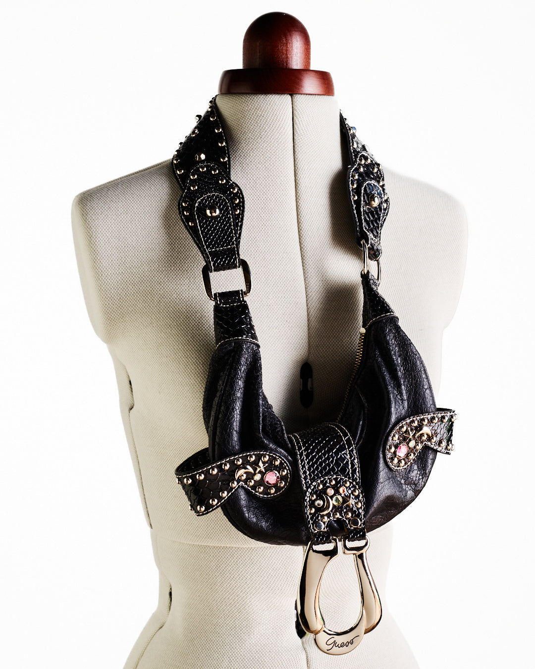 Vintage Guess mini black faux leather handbag. Very rare moon and star studded design. Studded and diamante handle. Zip fastening, 'Guess' embossed silver hardware. Inner and outer pockets. Logo printed silky lining.